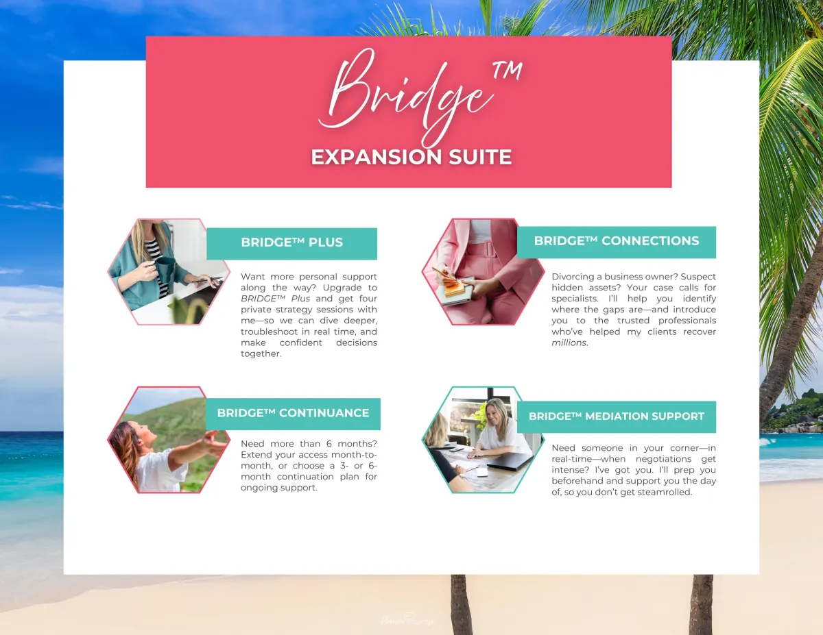 Many women do—and that’s why BRIDGE™ is built to grow with you. Once inside the program, you’ll unlock access to the BRIDGE™ Expansion Suite: a private menu of advanced support options (including private strategy sessions, mediation prep, trusted professional referrals, and more). You don’t need to figure it all out now. We start by building your foundation in BRIDGE™—and when you’re ready for the next level of support, I’ll help you navigate exactly what you need.