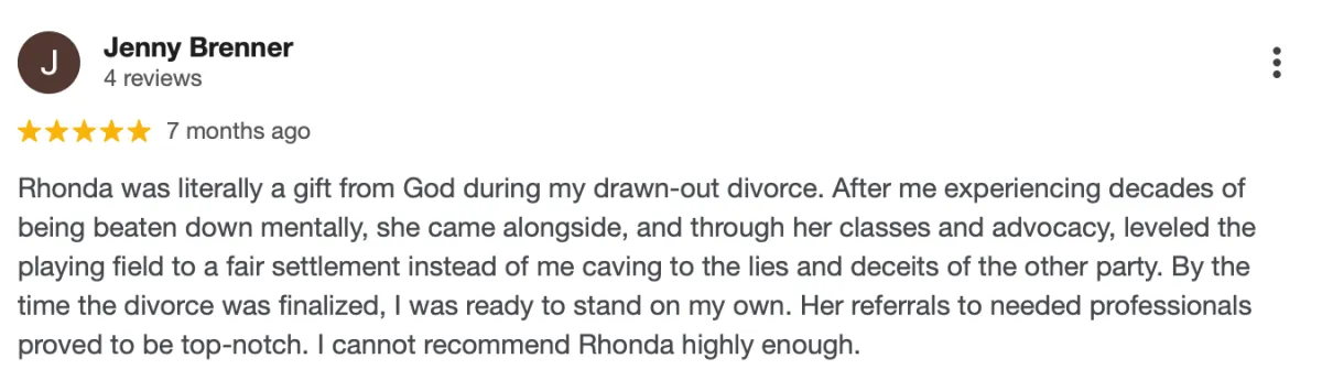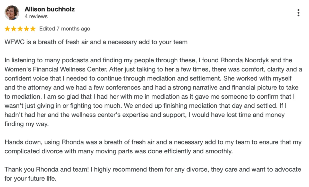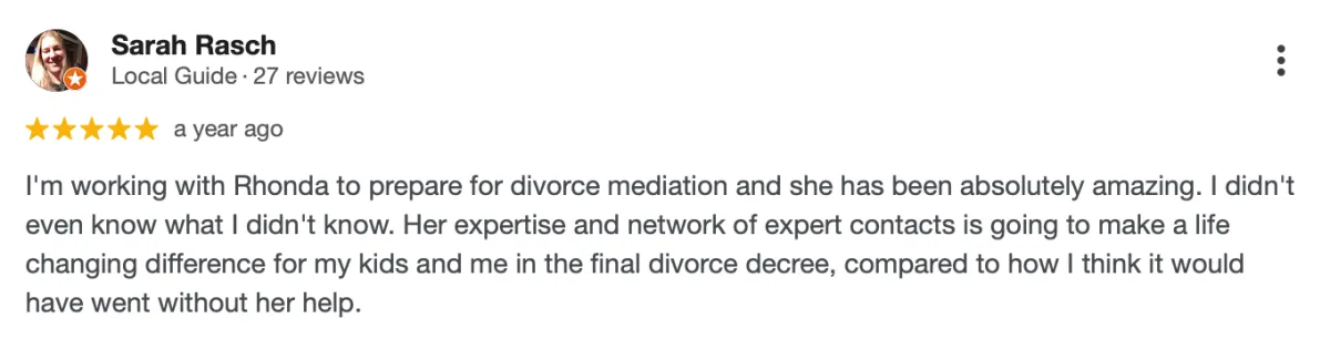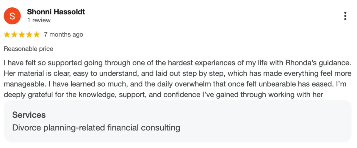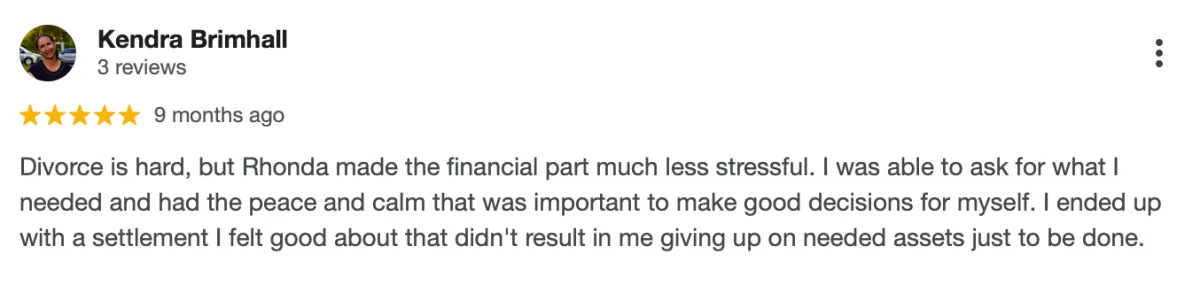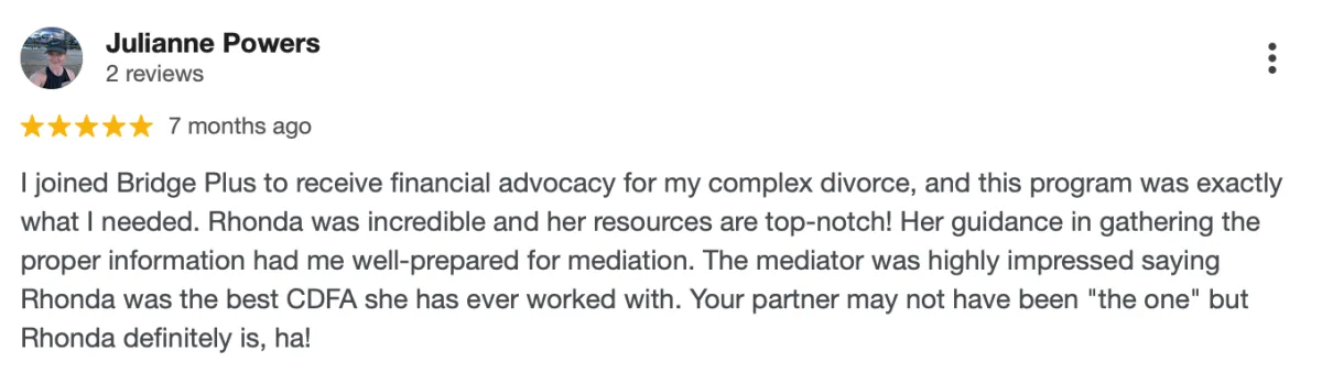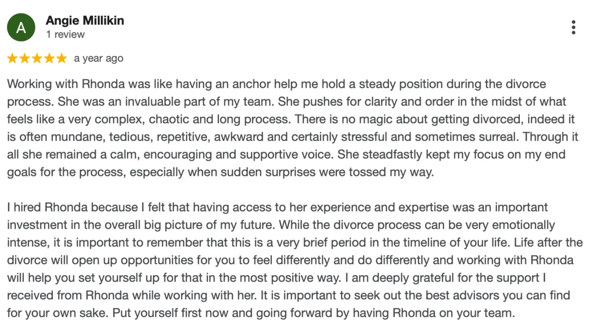 “ I wasn't feeling confident in my lawyer when it came to the financials. That’s when Rhonda came in and saved the day!”